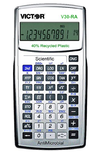 10 digit scientific calculator has a key layout and functions comparable to the TI-30XA. Calculator is engineered with an AntiMicrobial agent that reduces the growth of microbes and bacteria that can cause discoloration and odors. Environmentally friendly, this calculator is manufactured with 40% recycled plastic. The feature loaded functionality makes this model an excellent choice for general math, algebra, geometry, trigonometry, statistics and science. The stylish silver with black and white accents gives the calculator a contemporary look. Other innovative features: multiplies, divides, subtracts, and adds fractions in traditional numerator/denominator format, performs degrees/radians/grads, polar/rectangular conversions and fraction/decimal conversions and has 3 memories. Includes protective hard shell case. Battery powered. 2 Year Manufacturer's Standard Warranty.